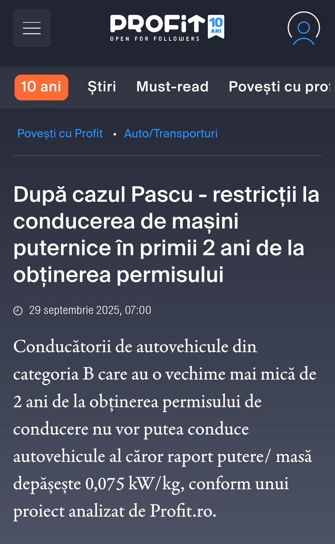 Ei zic că în primii doi ani de permis auto, să conduci Logan, sau Sandzero , că na, la 1 tonă 75kw/ 100 de cai frumoși. Deci 100 de cai pe tonă. Daciile au, de regulă, sub. Dar unele au peste și ălea , lol. Ce te faci, dacă ești părinte și vrei și tu tabla peste 100cp/tonă, dar copilul nu are voie? Să ia bicicleta doi ani, dă-l în pizda mă-sii.