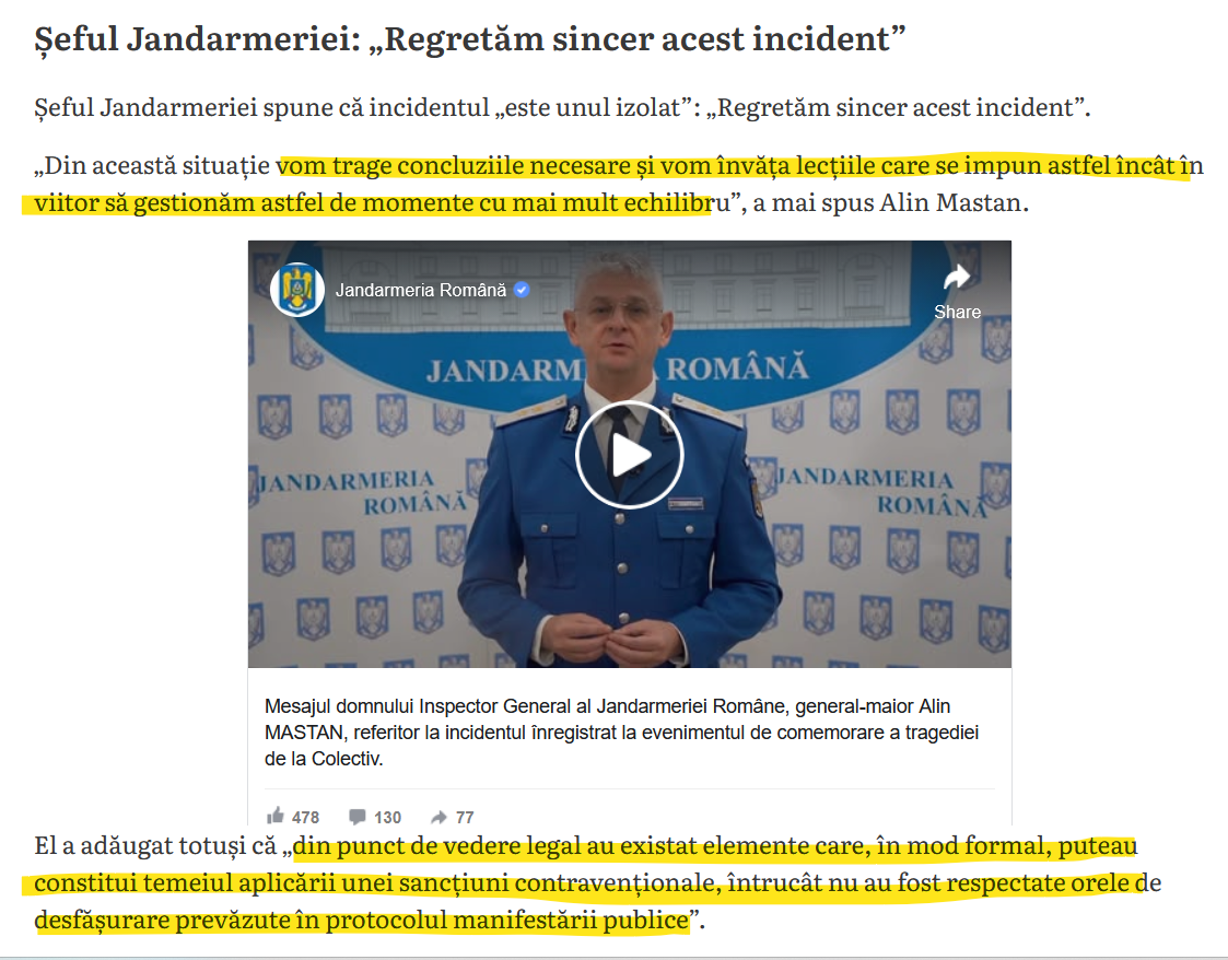Nici că a ieșit șefu la jandarmerie să spună că regretă incidentul și că o să învețe lecțiile ”care se impun” – ce dreacu să-nvețe ăia vreodată.  Treaba lor.
