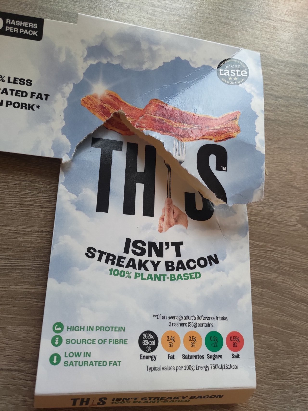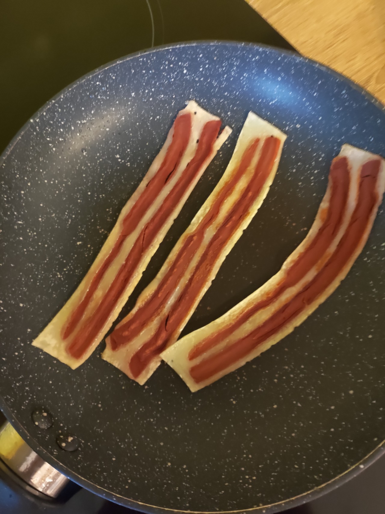 Am văzut la supermarket niște șuncă ( bacon) feliată, care arăta într-un mare fel. Într-un fel, de zici că era Bacon HDR în format IMAX. Unui om normal la cap asta i-ar da de gândit, dar nu mie, eu am cumpărat-o direct. Și-am pus-o pe soție s-o prăjească în tigaie – bă, nici nu mănânc în general așa ceva, dar aveam poftă. Și a început să scoată niște fumuri de ne-am speriat. Și soția mă întrebase dacă e ceva vegetarian, dar n-am băgat de seamă.