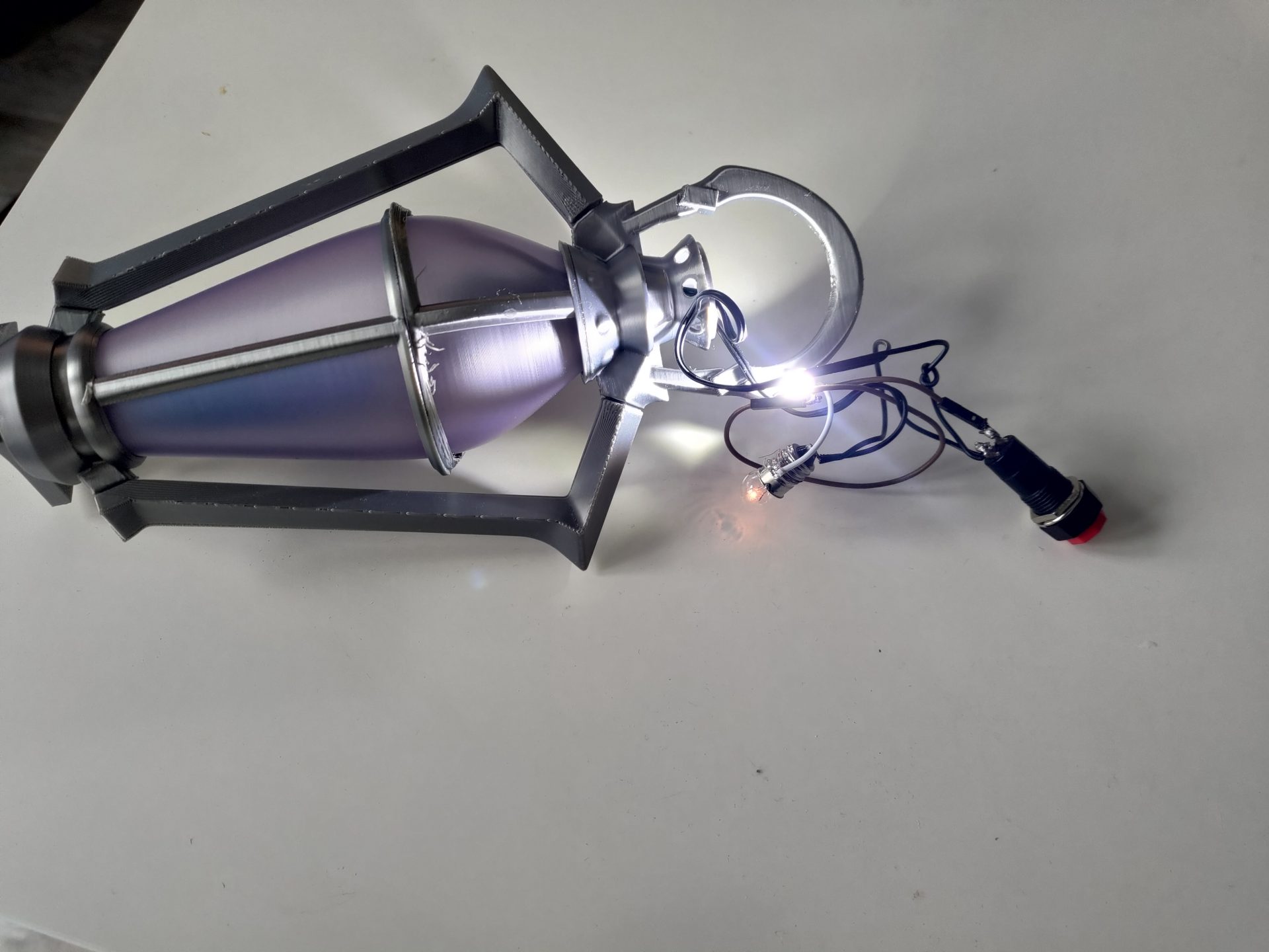 Instalația electrică rudimentară nu a fost printată, am cumpărat o baterie de litiu cu tot cu soluția de reîncărcare pe USB , led, aveam deja acasă întrerupător și a trebuit să pun in serie un bec incandescent că ledul nu se potrivea pe baterie. Anume bateria scoate 3.6-3.9 Cu, ledul se aprinde de la 2.5 în sus, deci nu pot lega 2 in serie, că nu se aprind , dar se arde la 3.7 volti, va trebuie să funcționeze la 2.5 și nu aveam nici timp nici rezistențe potrivite pentru a face punți divizoare de tensiune. Așa că am aplicat soluția țărănească, dar care merge – un bec care funcționează nominal la 1.5V în serie. În cazul de față datorită diferențelor de rezistență, căderea de tensiune pe becul incandescent este doar de circa 0.7-0.8V.