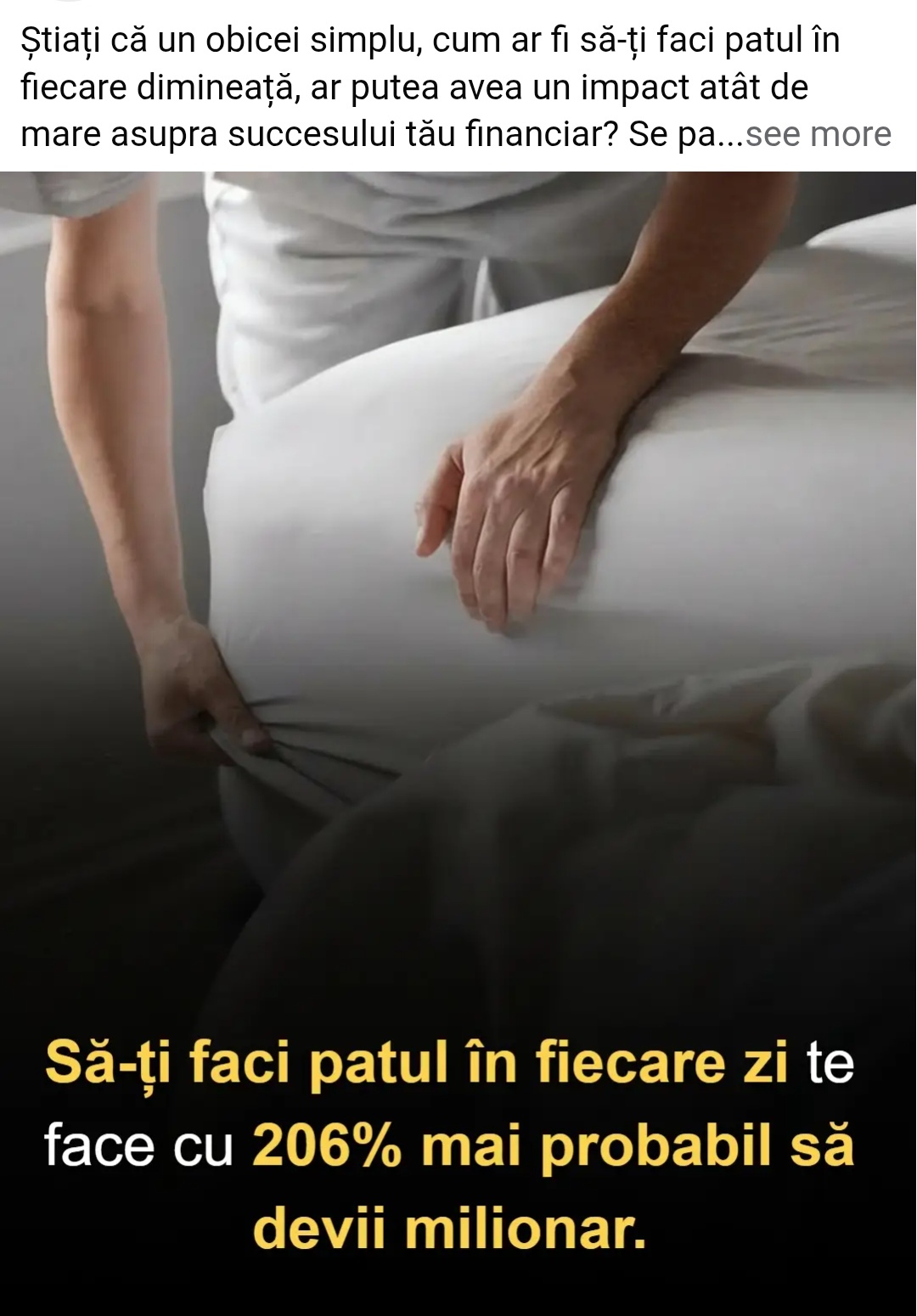 I-am spus că și eu îmi fac patul in fiecare dimineață ( mințeam, dar discutam filozofic ) pentru că există un studiu efectuat pe milionari, care a găsit o corelație in asta și de unde rezultă că dacă îți faci patul în fiecare dimineață îți cresc șansele cu peste 200% să ajungi milionar. Fie vorba între noi, nu mai înseamnă mare lucru asta, în zilele noastre – sunt trei milioane în UK, în mare datorită prețului caselor.