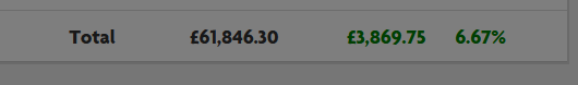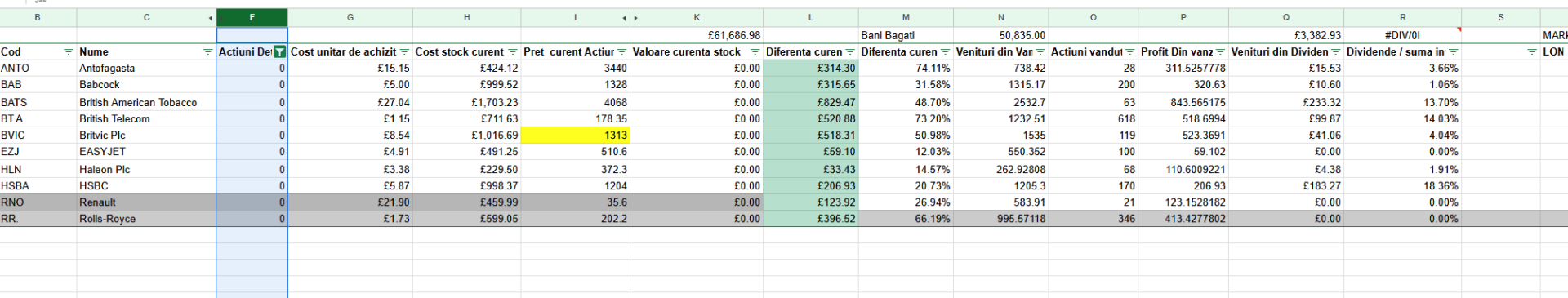 Dacă te uiți brut. Am băgat din poznar 50,835 de bani. Și la momentul când scriu, portofoliul e evaluat pe la 61,500. Diferența dintre excel și site-ul ălora ține de surse de evaluare diferite și rotunjiri. Deci pe la 21% așa, din dividende + vânzări anterioare ( clișeele sunt intenționate).
