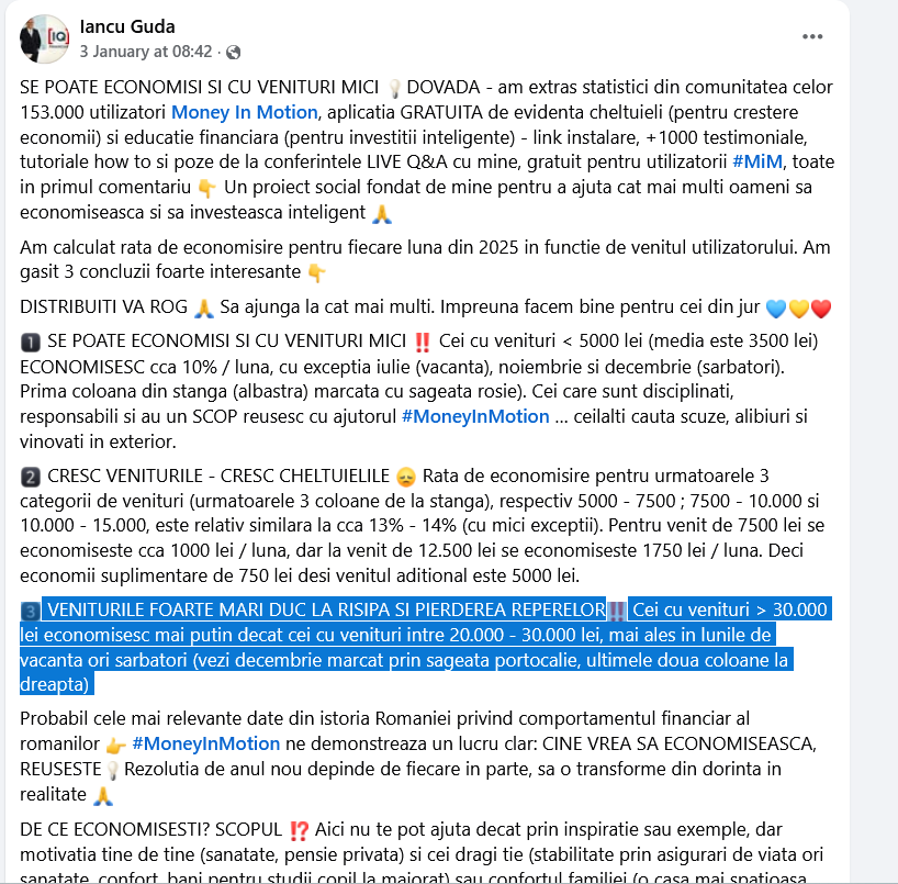 Ce zice omul acolo nu e chiar cum a fost interpretat prin presă – practic, spune că a observat el în studiile proștilor care decid să ia sfaturi de la el că oamenii cu venituri foarte mari economisex mai puțin ( procentual) decât cei cu venituri mai mici. Și poate fi adevărat la nivelul subiecților care cred că el este un om de la care să iei sfaturi – despre cum să trăiești într-o garsonieră până la 30 și ceva de ani și să-ți permiți ”luxul” să te muți în apartament, nu mai caut linkul ăla.