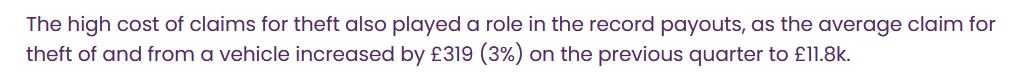 Zic ei că costurile medii legate de furturi din vehicule și de vehicule au crescut cu 3% de la un trimestru la altul și au ajuns la un cost mediu de 11.8k lire.