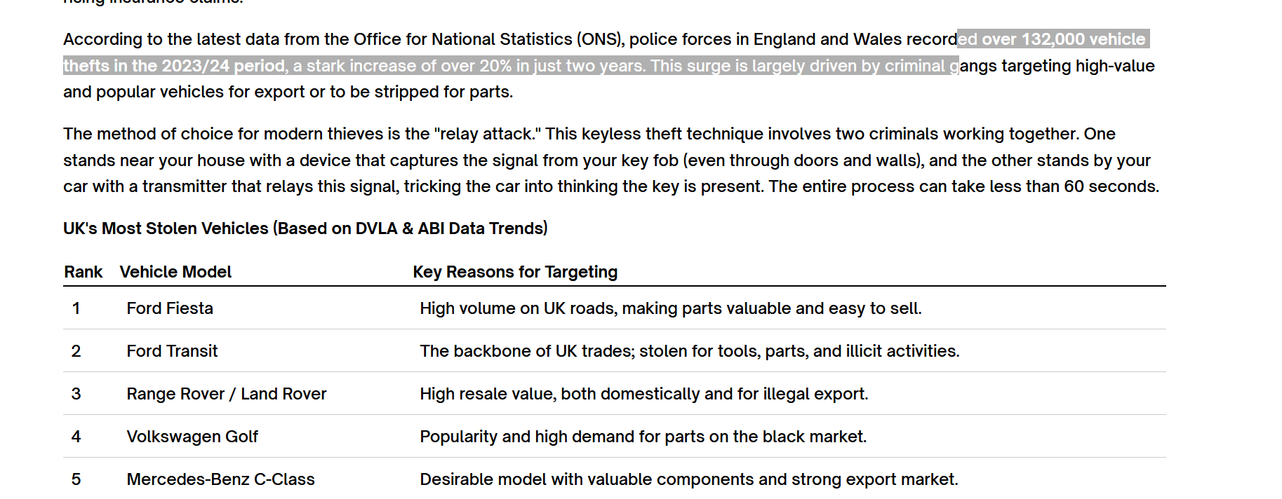 Între 2023-2024 furturile au crescut cu 20% ( în un an, bă). Am trecut de la epoca când se furau cel mai bine Range Roberuri, pe lux și eleganță, pentru margine mare de profit, la epoca când cele mai furate mașini sunt cele mai populare și ieftine ( Ford Fiesta / Ford Transit). În punctul ăstea e deja simptomul faptului că nu există ”enforcement”, adică activitate polițienească relevantă pe tema asta în UK. Nu există, bă, să ai 132,000 de mașini furate în 2 ani. Se fură undeva între 5-10% din mașinile înmatriculate anual în UK.
