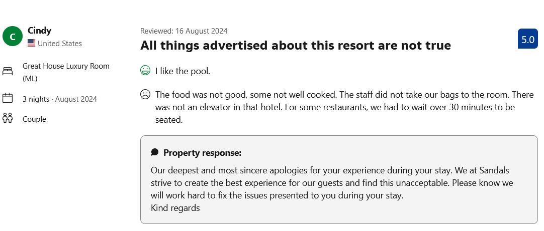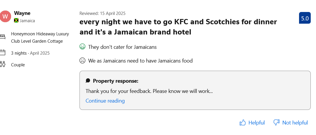 Și m-am dus la ăștia, Sandals Ochi, că știu care e dilul, la ce să mă aștept, astea. Am văzut, înainte să plec acolo , dar după ce cumpărasem biletele, review-urile ăstea 2 pe booking. Am cumpărat pachetul cu British Air – și n-aș fi cumpărat de la booking.com oricum, dacă nu era așa, luam zboruri separate și pachetul direct de la Sandals, că sunt înregistrați în UK cu ATOL protected ș.a.m.d.
