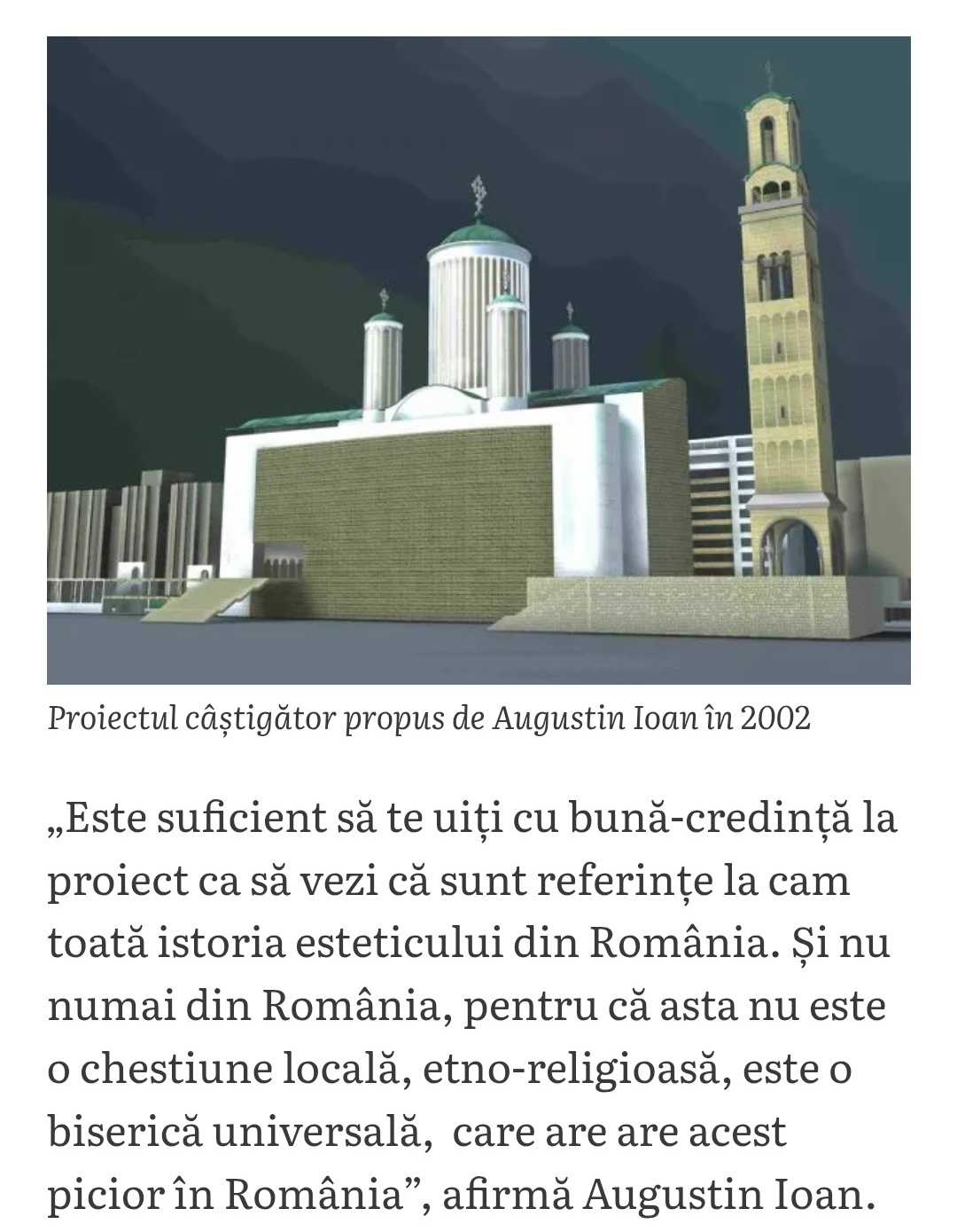 Citeam ce zicea un lache flaușat, arhitectul Augustin Ioan, profesor la Arhitectură în București , invidios că după ce a câștigat proiectul lui concursul bisericoșilor de la BOR nu le-a plăcut și l-au înlocuit cu ce se vede acum ( au schimbat și amplasamentul ) și că “arată bătrânicios, dar nu este tradițională” . Bă!!! Bă, nebunule!
