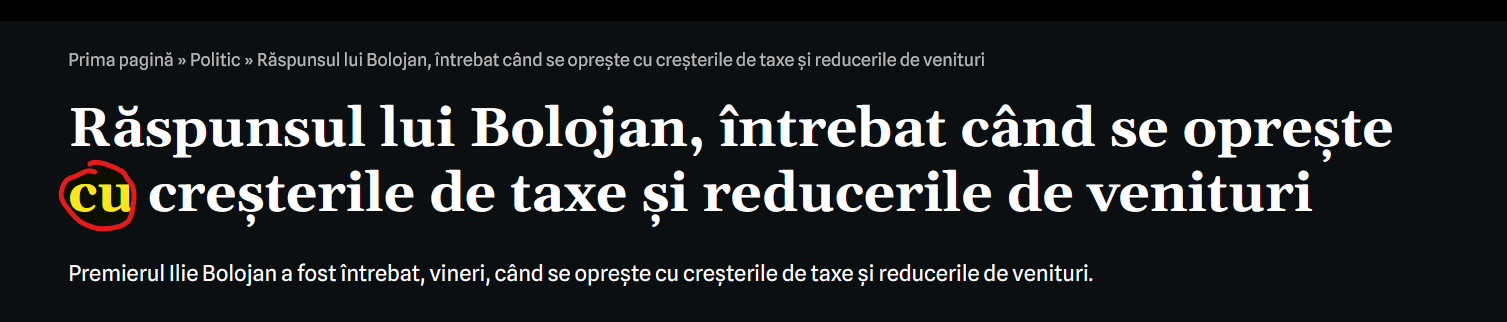 Din, băi, din. Când se oprește din, nu când se oprește cu, că nu ia pastile cu creșteri de taxe și reduceri de venituri ca să se oprească din ceva. Bine, autoarea se numește Andrea Tobias și are doar 30 de ani de experiență în jurnalism ( așa scrie pe site-ul redacției), nu înveți așa repede.