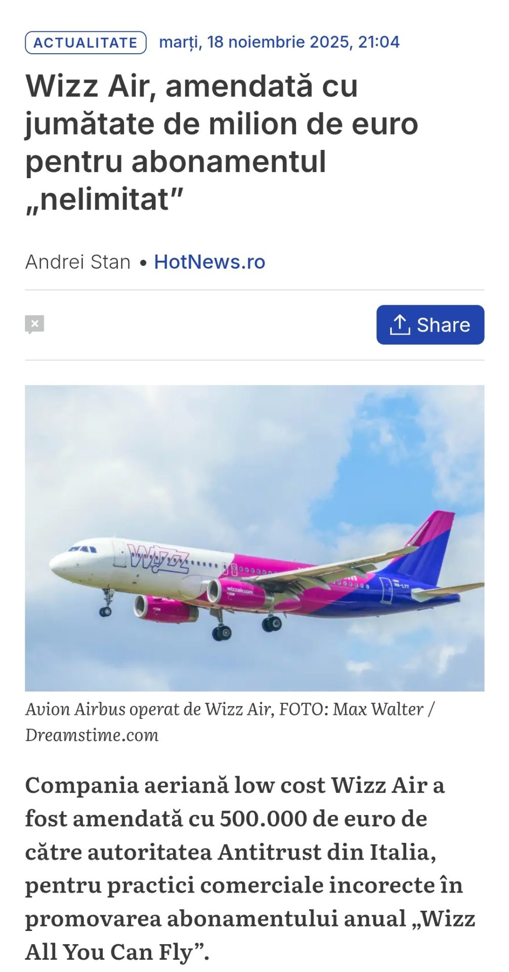 Că uite, Wizz au luat amendă 500,000 de euro pentru schema cu abonamentul “all you can fly” pe care au promovat-o mincinos. O aruncă în România de anul trecut, cu promovare mincinoasă, uitând să prezinte limitele și faptul că nu e chiar all you can fly.