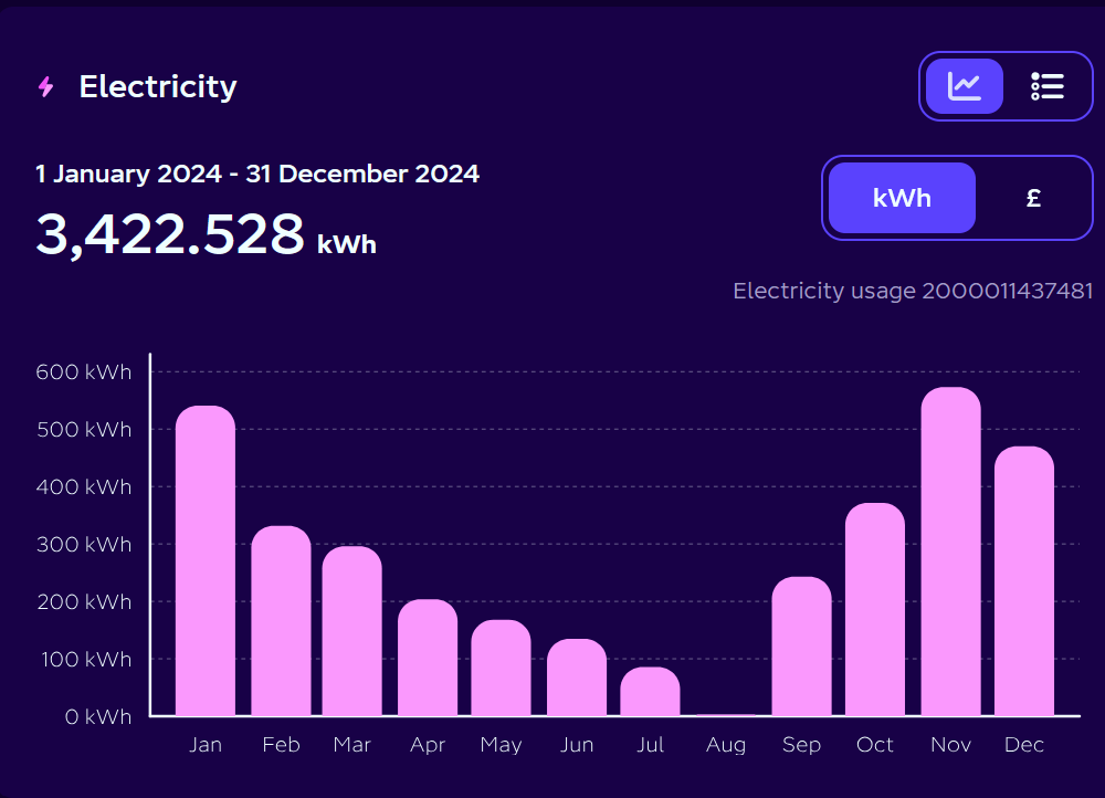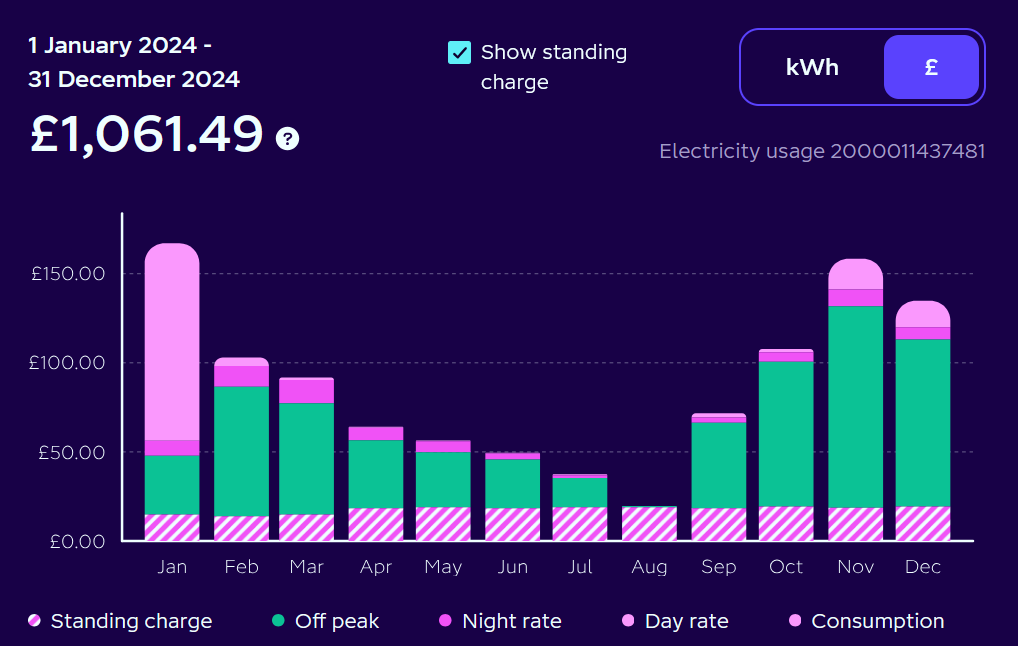 Rezultatul – Pe 2024 am plătit pentru curent pas’tecinășiop’ dă lire ( 458) pentru curentul electric consumat din rețea. Partea aia hașurată alb/fuchsia e ”standing charge” abonament – de care nu pot scăpa, dacă nu mă debranșez și a fost între 14 și 19 lire / lună – (s-a scumpit cândva) . Deci le plătesc ăstora undeva la peste 200 de lire pe an și dacă n-aș consuma nimic, pentru premium membershit, cum ar veni. #aiae. MULT! Chestia aia roz deschis e ce vreau să evit, ”day rate – cel mai scump, între orele 16 -19, oar fuchsia ăla mai aprins, night rate aș vrea cât mai mult că e ieftin. Dar aveam bacterii mici și puține, până în iunie anul ăsta.