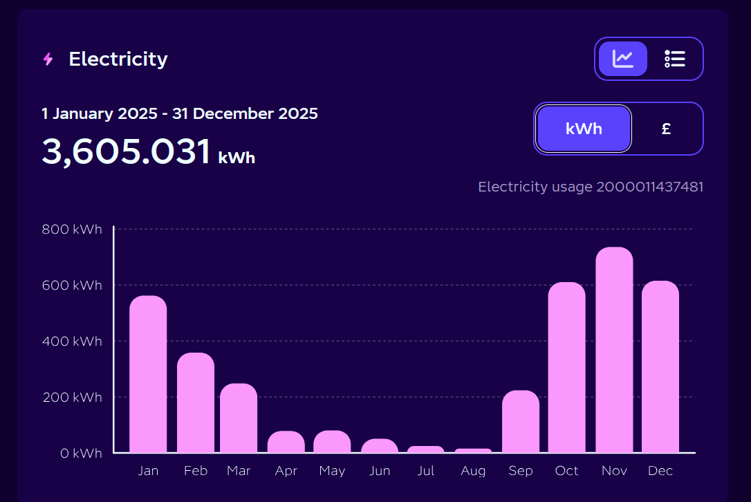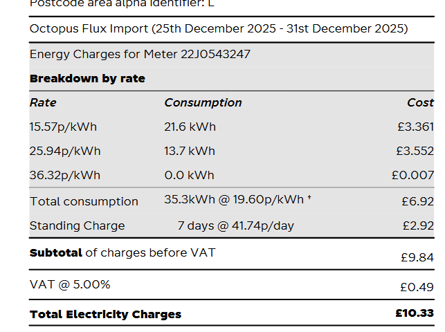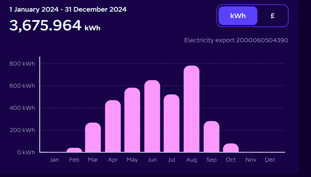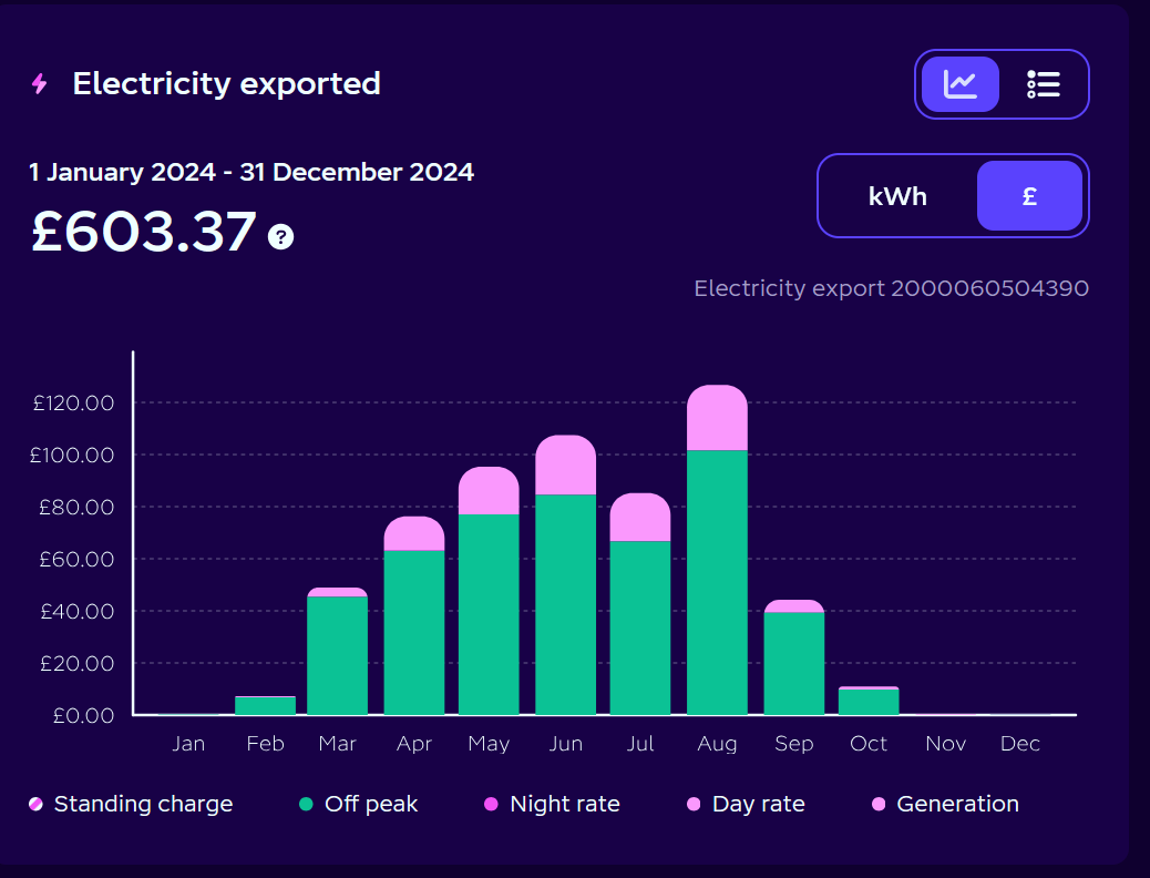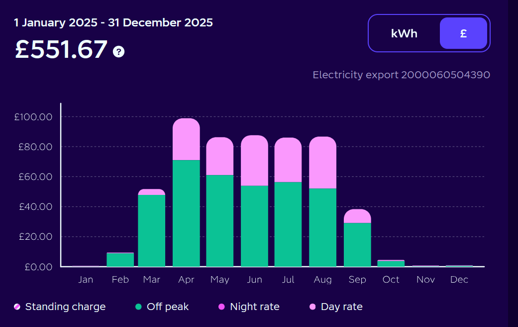 În bani, am consumat curent de 1105 lire de la ei, datorită faptului că au schimbat un pic tarifele, dezavantajos pentru mine, cum altfel. Se vede că din septembrie, pentru că am baterie mai mare, am modificat și eu consumul un pic , ca să consum mai mult noaptea și cât mai puțin pe peak, dar tot m-au mai prins și oricum, au scumpit un pic curentul în night-rate, aia e, era prea ieftin și au apărut mai multe mașini electrice în zonă care îl speculează – era de așteptat. Se vede că în Iulie august e mai mult standing charge decât consum.
