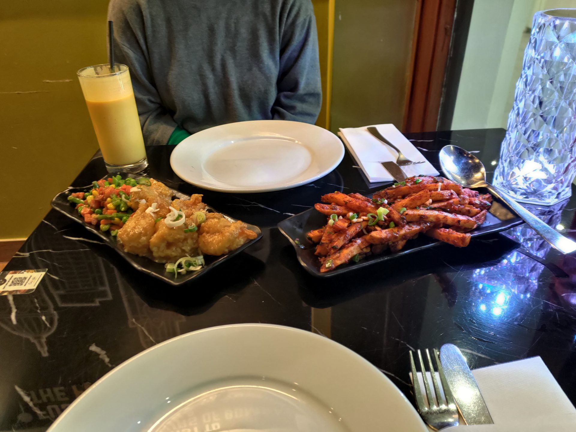 Mi-am luat mai întâi o bere indiană mediocră să îmi fac curaj, dar după ce au adus mâncarea am cerut și Cola. Medium spicy. Eu glumesc dar cam așa era.