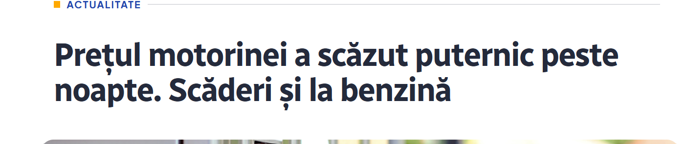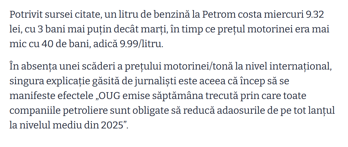 Am alimentat alaltăieri, sau ceva cu motorină la 10.5 lei/ litru. Singurul lucru in efect de atunci și până la 9.99 ( turul doi ănapoi) este , că i-au obligat să mențină adaosurile ( ordonanța zice ”reducă”, că le crescuseră deja) la nivelul de anul trecut. Procentual. La 50%. Deci în sumă absolută adaosul tot crește și el cu prețul petrolului, dar procentual e limitat.